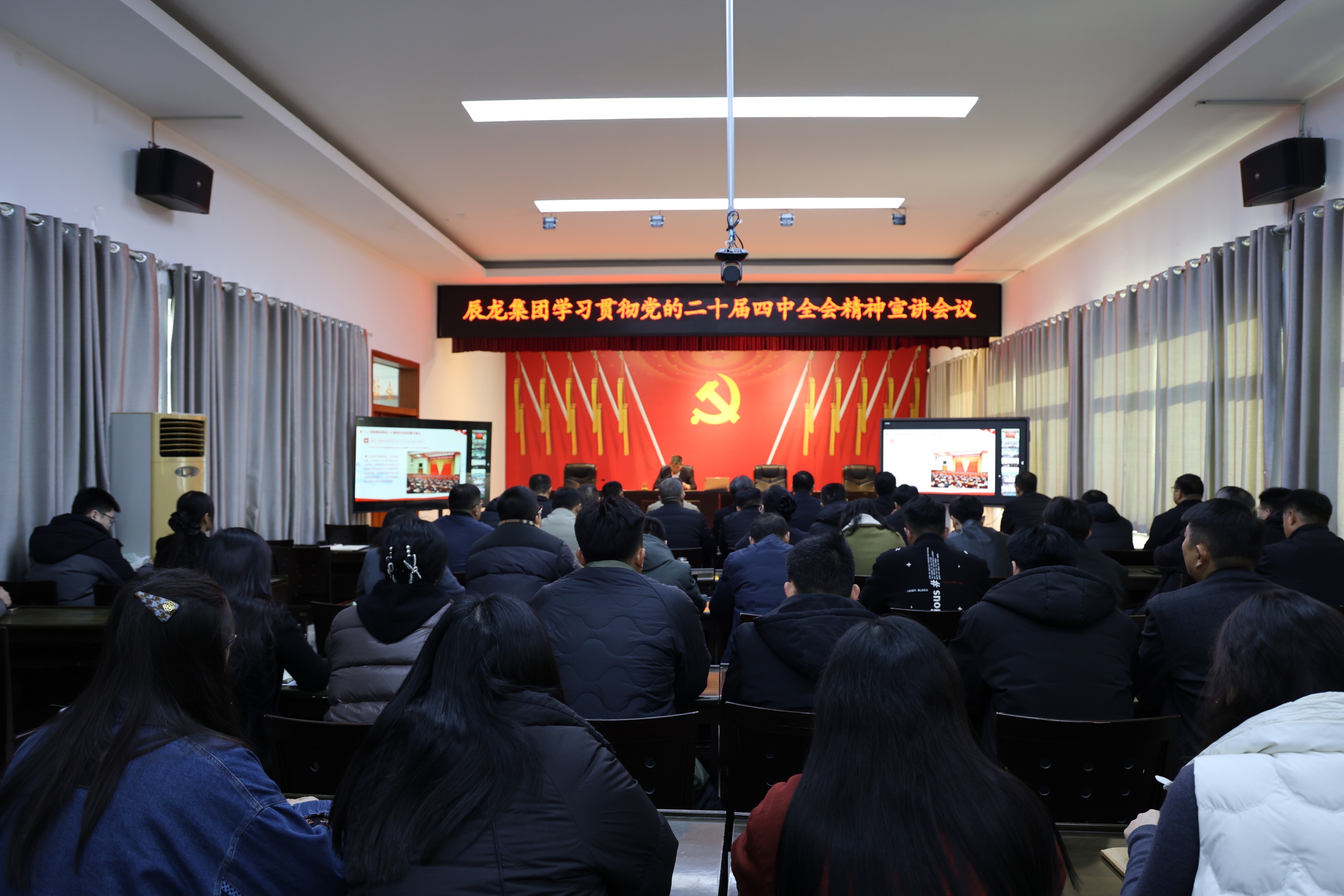 12月15日,辰龍集團(tuán)學(xué)習(xí)貫徹黨的二十屆四中全會(huì)精神宣講會(huì)議舉行,集團(tuán)黨委書記、董事長宗成偉作宣講報(bào)告。集團(tuán)領(lǐng)導(dǎo)班子成員、總部全員在主會(huì)場參加會(huì)議,各企業(yè)中層正職以上干部及黨員群眾代表在6個(gè)分會(huì)場以視頻會(huì)議形式參加。